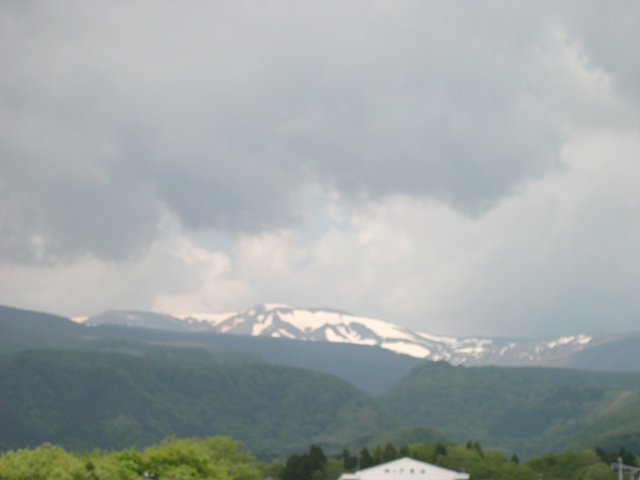 屋根の上から蔵王を眺めると、残雪が見える。美しい!