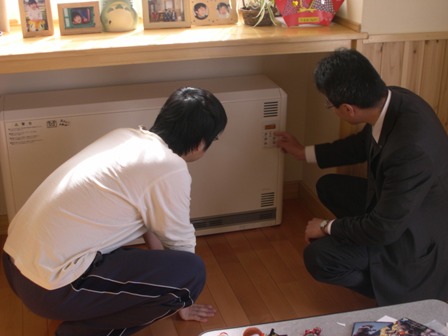 暖かくなってきましたので、 シーズンオフの、蓄熱暖房器の取扱い説明に メーカーさんと一緒に 点検方々、Tさん宅におじゃましました。 ご主人さまも、真剣に聞いてくれました。 昨年末から、がんばってくれた、蓄熱暖房器も間もなく お休みが近くなってきました。 そろそろ、蓄熱量も30%くらいで間にあいますね。 使用しなくなったら、蓄熱量を0%にして、 200Ⅴ電源ブレーカーは切りましょう。 また、次シーズン頑張って活躍してね。(^.^)/~~~