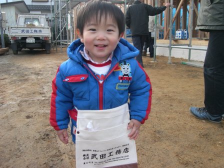 上棟の当日、釘袋をさげて場内を駆ける若者が! I 様のお子さんでした。元気ですねぇ。 将来の志しは大工かな?と思いや、 「シュワッチ!」どうやら、今のところはウルトラマンのようです。 正義の味方なら、おじさんも応援するぞ!!(^。^)ノ ちなみに、釘袋の中身は、ひろったお餅でした。(^o^) お餅を食べて、かいじゅう退治だぁー!