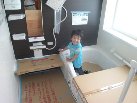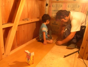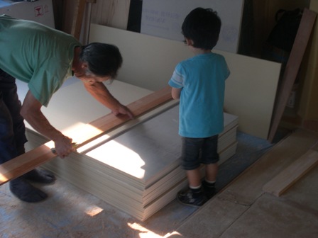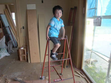 パパ、ママが打ち合わせをしている間、すっかり 大工さん修行中 です。